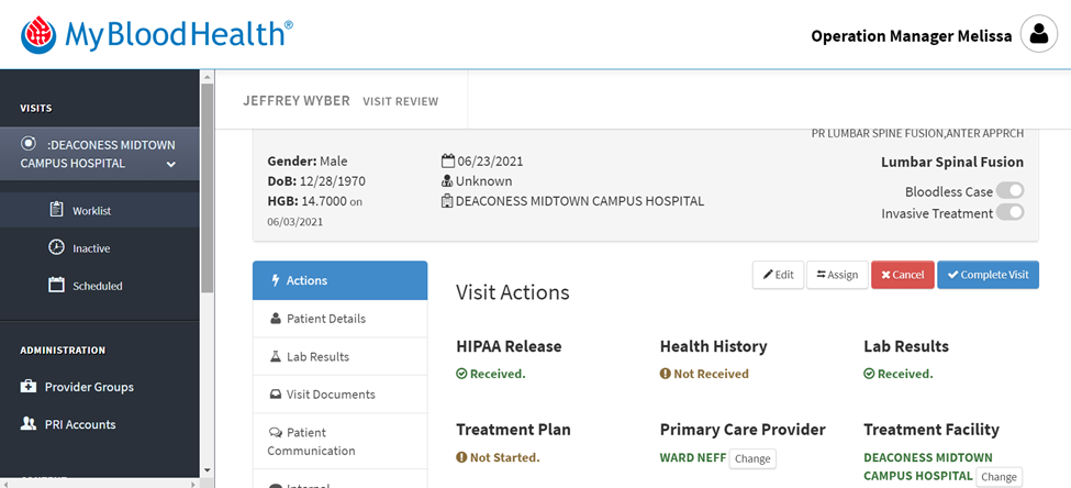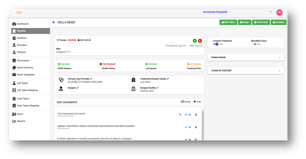 The user will click on the worklist tab on the left-hand side toolbar. They will then select the patient they would like to review. When they click on their name, the case review will appear. On the main page, the user will see the patient demographic, what pertinent information was received, physician/surgeon information, treatment facilities, documents, labs, etc. Also, on this page they will be able to select if the patient requires invasive treatment or is a bloodless case.