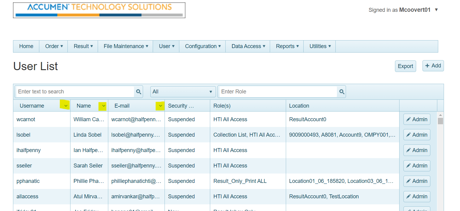 Field Sorting on User Page: Users with access to User Management will be able to complete an ascending or descending sort of the User List by UserName, Name, E-mail, and Security User State. To sort by UserName, Name, and E-mail, use the drop down arrows at the top of the columns:
