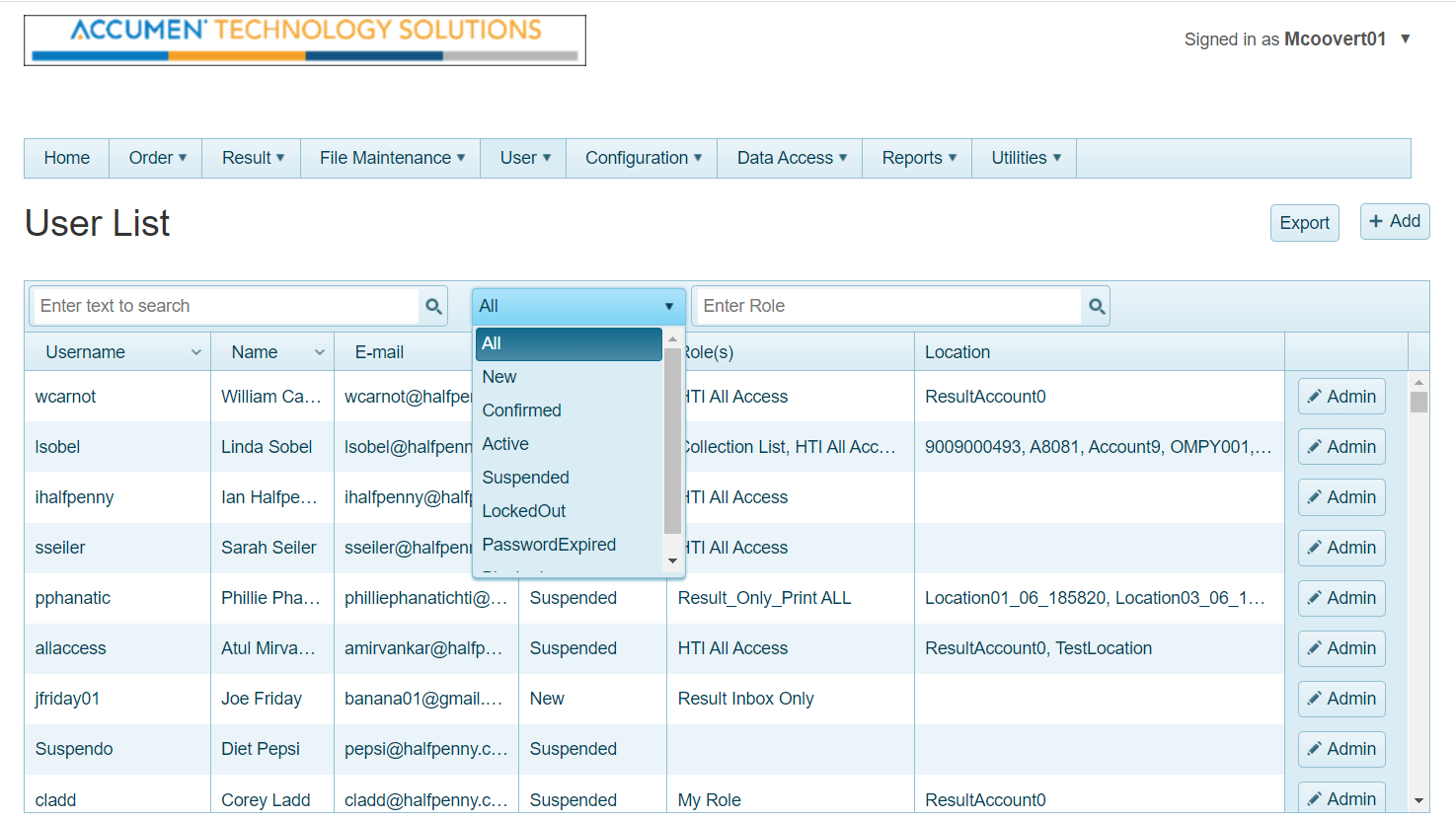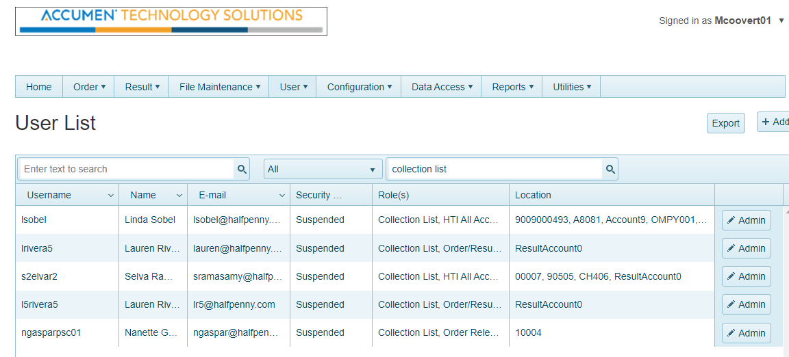 Filter by Role: Limit your user search to users with a specific role using the search bar. When a role is entered and the search is executed, all records containing that role will be listed. This search can be combined with the general text search for a more comprehensive list.
