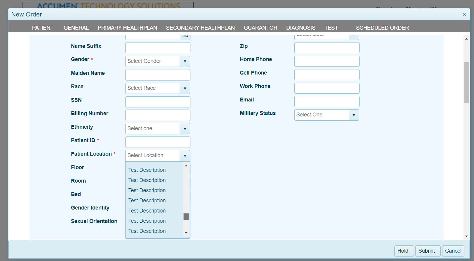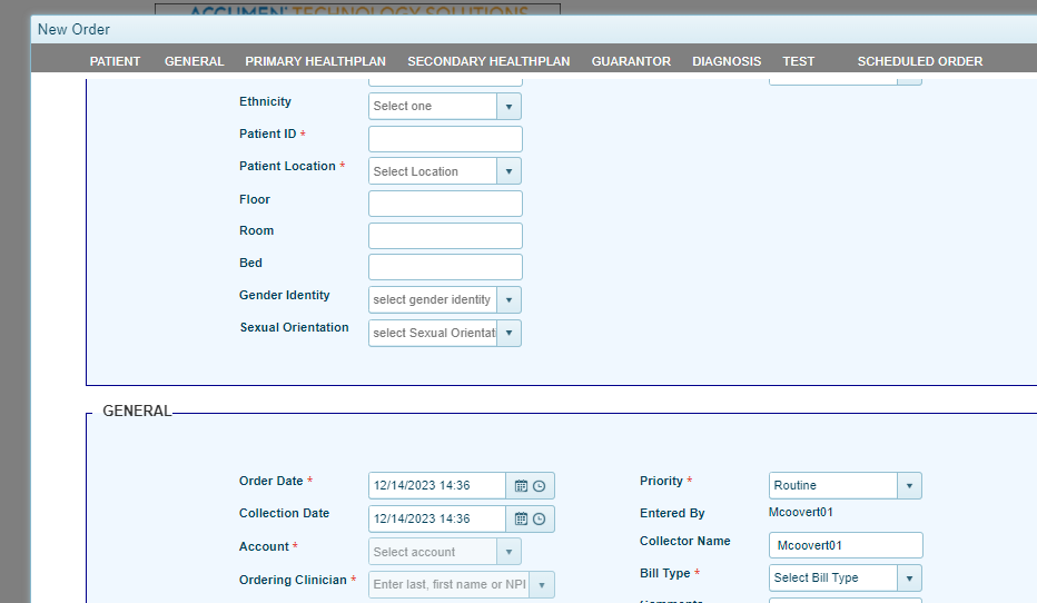 Account and Clinician Field Dependency: Users are now limited to only select accounts in the general section that are linked to the patient location to which the patient is linked to when creating a new order. The account field is greyed out until the patient location is populated. After the field is populated, the account field becomes actionable. Clicking on the account dropdown list will only display the accounts linked to the location selected. If the patient location is updated when creating a new patient, the account and clinician fields will blank out and need to be re-entered.