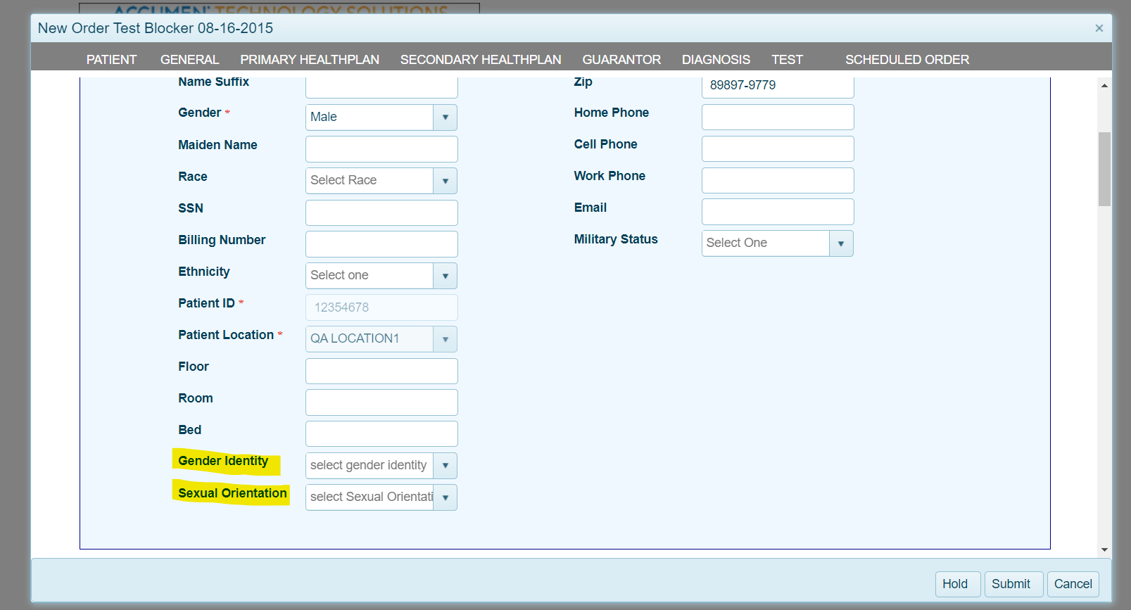 Gender Identity and Sexual Orientation Fields on Sample New Order Page