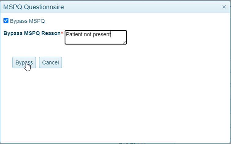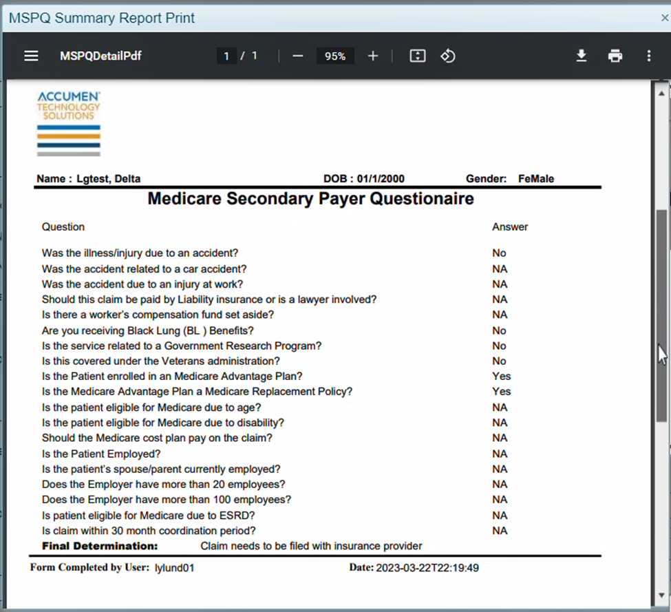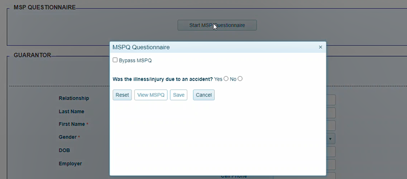 c. Selecting ‘Start MSP questionnaire’ will open the MSP Questionnaire window and present the user with the MSP decision tree questions. Once an endpoint on the decision tree is reached, the final payer determination will display onscreen with the notification the MSP Questionnaire is complete. Selecting save will open the MSPQ Summary Report and record the answers to the patient’s record with the timestamp. Users can then continue with the normal record processing. When enabled, if the user tries to Submit or Save a record without filling out the MSP Questionnaire, they will receive an error message. Alternately, the user can select ‘Bypass MSPQ’ and enter a bypass reason to satisfy the MSP Requirement on the order