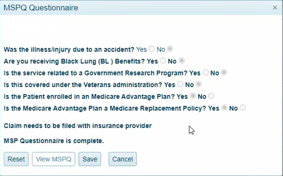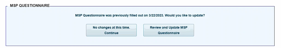 d. The completed MSP Questionnaire is valid for 90 days. If creating, viewing, or editing a record on a patient within the 90-day window, the date of the previously saved MSP Questionnaire will display with 2 prompts. User can Select ‘No Changes at this time’ and continue with the with the normal record processing. Selecting ‘Review and Update MSP Questionnaire will open the MSP Questionnaire Window with final payer determination allowing the user to confirm previously saved answers. If updates are required, selecting Reset will restart the decision tree and upon saving, record the new answers to the patient’s record updating the timestamp and allow the new form to be printed.