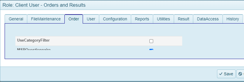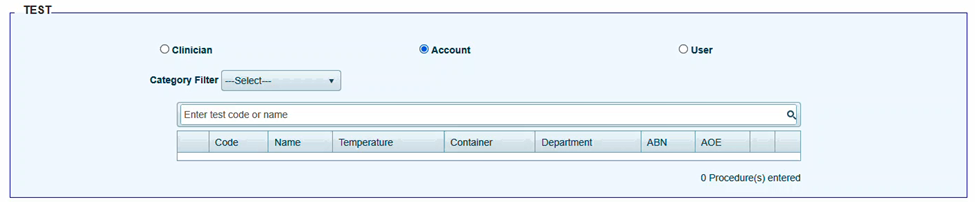 The OM-Portal application contains a configuration setting allowing for the filtering of tests by category on the New Order test page. With the configuration enabled, the UseCategoryFilter can be turned on at the role level. Users logged in with a role where Category filtering is enabled will see the Category filter display in the test menu section of the New order page. Once a category is selected, test searches will be limited to orderable tests linked to the selected category.