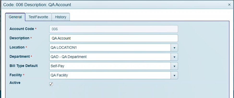 d. To ensure Accounts are shown the correct test menu and specimen requirements for the facility they will send specimens to, the Account maintenance page is updated to link it to a primary performing facility. When the Account is entered in the New order page, it will automatically filter the test search to match the compendium linked to the facility