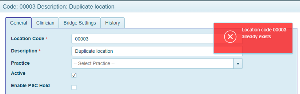 Improved error messaging added to notify the user if a duplicate record is being created on the following file maintenance screens: Location, Practice, and LOINC