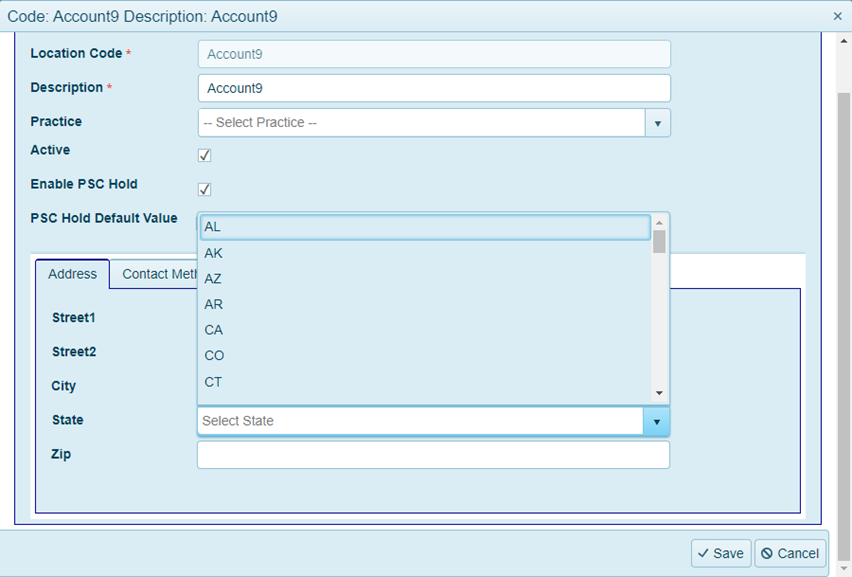 Maintenance screens that include state address fields, are updated to disallow Free texting the State name. The state must be picked from a dropdown list. This change applies to the Location, Clinician, and Department pages.